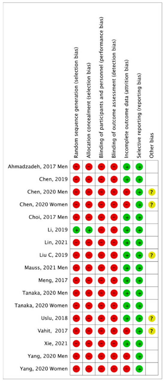- Higgins, J.P.T.; Altman, D.G.; Gøtzsche, P.C.; Jüni, P.; Moher, D.; Oxman, A.D.; Savović, J.; Schulz, K.F.; Weeks, L.; Sterne, J.A.C.; et al. The Cochrane collaboration’s tool for assessing risk of bias in randomised trials. BMJ 2011, 343, d5928. [Google Scholar] [CrossRef] [PubMed]
