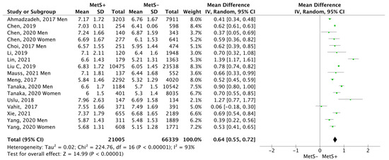 Figure 4 shows the Forest Plot, including the results for both sexes from the 14 review articles. MetS+ subjects showed a higher mean leukocyte count, namely the mean difference was 0.64 cells ×109/L (CI95% 0.55–0.72; p < 0.00001; I2 = 93%), compared to MetS− subjects.