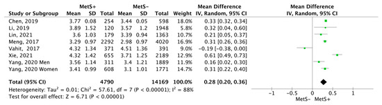 MetS+ subjects showed a higher mean number of neutrophils, specifically, the mean difference was 0.28 cells ×109/L (CI95% 0.2–0.36; p < 0.00001; I2 = 88%), compared to MetS− subjects (Figure 6).