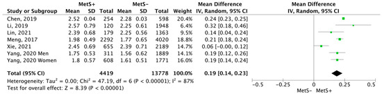 In relation to lymphocytes (Figure 7), MetS+ subjects showed a higher mean, the mean difference was 0.19 cells ×109/L (CI95% 0.14–0.23; p < 0.00001; I2 = 87%), compared to MetS− subjects.