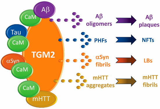 The second classic biomarker for AD is neurofibrillary tangles (NFTs), which are primarily accumulations of modified Tau proteins. Tau is a multifunctional, microtubule-associated protein family member, which upon phosphorylation (pTau) is dislodged from microtubules where continued phosphorylation on multiple sites, which occurs in AD, can generate toxic forms of the protein [43]. Soluble non-toxic pTau monomers become toxic when they oligomerize at an early stage in the formation of neurofibrillary tangles (NFTs). Calmodulin binds to Tau’s tubulin-binding site, and this binding may be involved in microtubule stability, an event linked to neurodegeneration [44]. However, unlike the situation with Aβ, the potential involvement of CaM in Tau oligomerization appears to remain unstudied. Transglutamase 2 (TGM2) is associated with multiple neurodegenerative diseases and expressed at elevated levels in AD brains where it localizes to senile plaques and NFTs [45]. TGM2 catalyzes the cross-linking of AβPP, Aβ, and tau, contributing to Aβ oligomers and paired Tau helical filaments (PHFs) [46,47]. TGM2 is a CaMBP that is also involved in ALS, HD, LBD, and PD, as discussed below [48].