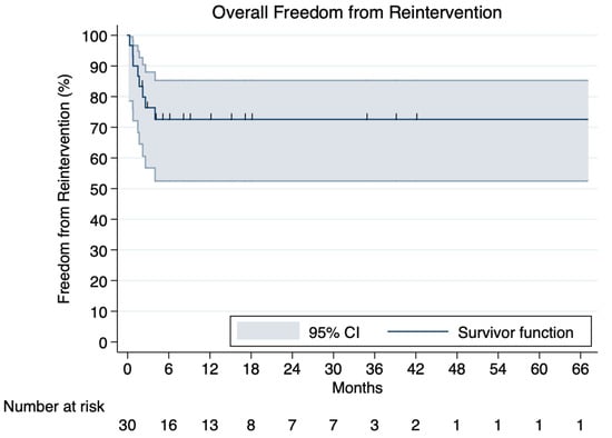 Reinterventions were required in 8.38% (95% CI, 1.68–17.90%) (n = 36) of the patients within a mean follow-up time of 32.40 ± 24.40 months. In total, 12 (33.33%) required an open repair, 6 (16.67%) underwent additional TEVAR, 4 (11.11%) had an aortic cuff installed, 4 (11.11%) underwent balloon expansion, 3 (8.33%) had embolization, 1 (2.77%) had an axillo-axillary bypass, and 1 (2.77%) had a TAVR. Peri-operative findings are summarized in Table 5 and Table 6 and a reconstructed Kaplan–Meier curve regarding freedom from reintervention is demonstrated in Figure 1. A diagram regarding reintervention rates is demonstrated in Supplementary Figure S2.