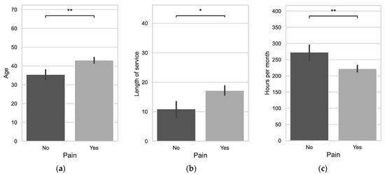 Age vs. Pain (a), Length of service vs. Pain (b), Hours per month vs. Pain (c); *: 1.00 × 10−2 < p ≤ 5.00 × 10−2; **: 1.00 × 10−3 < p ≤ 1.00 × 10−2.