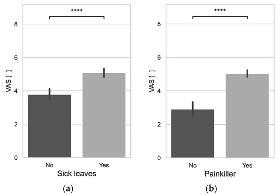VAS Scale vs. Sick leaves (a), VAS Scale vs. Painkiller (b); ****: p ≤ 1.00 × 10−4.