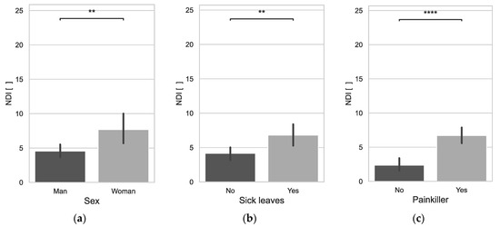NDI vs. Sex (a), NDI vs. Sick leaves (b), NDI vs. Painkiller (c); **: 1.00 × 10−3 < p ≤ 1.00 × 10−2; ****: p ≤ 1.00 × 10−4.