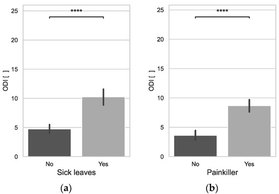 ODI vs. Sick leaves (a), ODI vs. Painkillers (b); ****: p ≤ 1.00 × 10−4.
