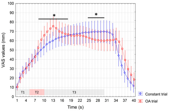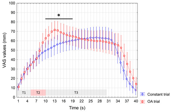 ANOVA performed to test differences in the VAS scores recorded during the OA and constant trials at baseline showed a significant interaction of factors (p < 0.0001). In the post hoc analysis, as expected, we recorded significant increased VAS values during the OA vs. constant trial (from the 10th to the 19th s, p < 0.05) due to the 1-degree increase in temperature at T2. Instead, no significantly reduced VAS values during the T3 were observed during the OA trial, indicating the absence of the OA phenomenon (Figure 2).