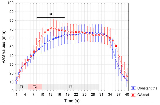 Similar findings were found during the sham session, as we observed significant interaction of factors (p < 0.0001) and, at the post hoc analysis, only significantly increased VAS values during the OA vs. constant trial (from the 8th to the 18th s, p < 0.05) (Figure 3).