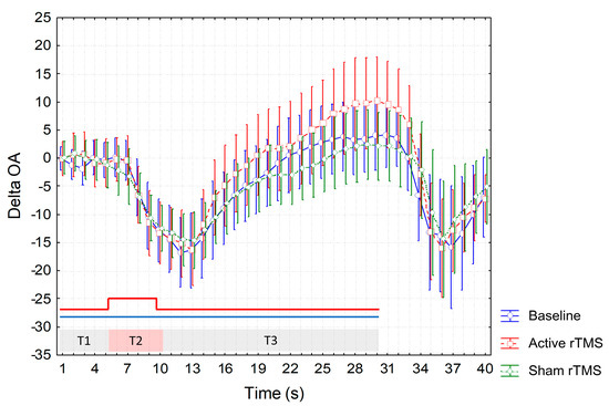 Though higher ΔOA values were recorded at T3 during the active session (Figure 5), ANOVA did not show a significant interaction of factors.