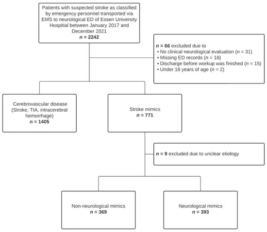 Flow chart of the study population. Abbreviations: ED, emergency department; EMS, emergency medical service; TIA, transient ischemic attack.