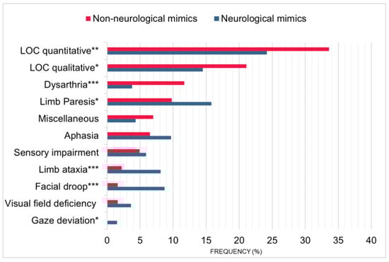 Frequency (%) of leading symptoms in n = 762 patients with non-neurological and neurological stroke mimics. The asterisks indicate a p < 0.05 (*), p < 0.01 (**) and p < 0.001 (***). Abbreviations: LOC, level of consciousness.