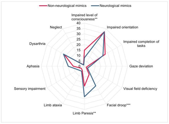 Frequency (%) of National Institutes of Health Stroke Scale (NIHSS) symptoms in n = 762 patients with non-neurological and neurological stroke mimics. The asterisks indicate a p < 0.01 (**) and p < 0.001 (***).