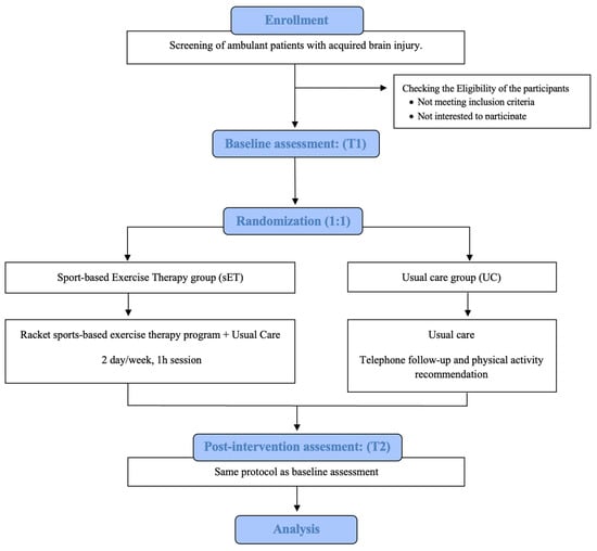 The study protocol describes the methods for a single-blind, randomized, controlled trial with two parallel groups. The trial will compare the effectiveness of a sports-based exercise therapy program in combination with usual care (sET group), versus usual care alone (UC group) in ambulatory adults with ABI. A flowchart of the study design according to the CONSORT guidelines is shown in Figure 1.