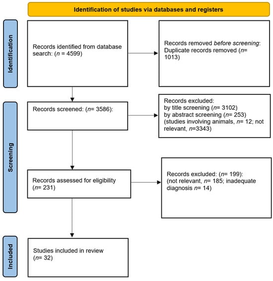 Database searching produced 4599 results. After the removal of duplicates, a total of 3586 articles were included. Two researchers (A.Me. and E.C.) individually reviewed the titles and abstracts of all the articles to determine their suitability. Subsequently, they proceeded to read the full text of these articles. Any disagreements regarding the selection of suitable articles were resolved through group discussion and consensus. After title and abstract screening, a total of 231 articles were assessed for eligibility. Of these 231 articles, 199 were excluded because they were not relevant to the topic (n = 185) or they included subjects with a diagnosis that did not meet our criteria (e.g., affective disorders with psychotic symptoms) [,,,,,,,,,,,,,]. Therefore, a total of 32 articles met our criteria and were included in the systematic review (see Figure 1 for the PRISMA flowchart of the selection process). In total, 21 studies concerned subjects with first-episode psychosis; 14 had a cross-sectional design, 6 were longitudinal studies, and 1 performed a network analysis. Additionally, 11 studies targeted the high-risk population; eight were cross-sectional and three were longitudinal studies. In total, data from 3086 FEP subjects and 1732 HR subjects were analyzed.