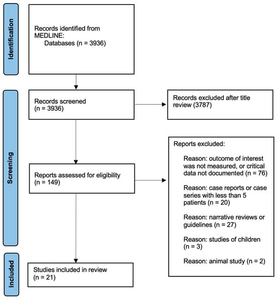 To identify relevant studies, a comprehensive search of the Pubmed/MEDLINE database was conducted to retrieve from inception to April 2022. A combination of Medical Subject Headings (MeSH) terms and text words related to pancreatitis and cardiovascular disease were used. MeSH terms included “pancreatitis”, “cardiovascular diseases”, “coronary artery disease”, “acute coronary syndrome”, “atherosclerosis”, “heart injuries”, “myocardial infarction”, and “heart failure”, along with additional keywords, such as “hypertriglyceridemia”. Only English-language literature involving human subjects was included, and a range of study types, including observational studies, case–control studies, cohort studies, and clinical trials, were eligible for inclusion. After screening and data extraction (Figure 1), the authors conducted a narrative synthesis of the studies, with the extracted data being summarized into tables for easy comparison and synthesis.