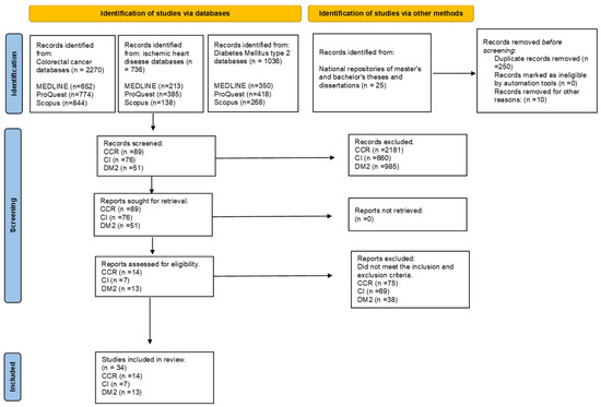 After applying the search strategy for each disease, the reviewers reached a consensus on how to approach data selection and extraction. One reviewer proceeded to assess the titles and abstracts of the studies found. The selected articles were then read through and assessed for inclusion and exclusion criteria by two reviewers independently. Once the criteria had been applied, the third reviewer verified the duplicate articles and proceeded to eliminate them. The articles to be analysed were selected and the team of reviewers prepared a table with the main characteristics for each article, for example, author’s name, year of publication, region of Spain, objective, methodology used and the relevant results of the study. Once the table was prepared, the reviewers independently assessed the methodological quality of the studies. Finally, a total of 34 articles, which covered the three diseases, were included, comprising 14 articles on colorectal cancer, 7 on ischaemic heart disease and 13 on diabetes mellitus type 2. The selected articles and their extractions are presented in the PRISMA flow chart (Figure 1).