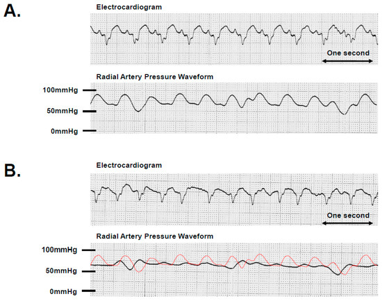 Changes in radial artery pressure with alterations in supraventricular rhythm. A patient with LVAD support exhibited paroxysmal atrial fibrillation shortly after implantation. (A) A monitoring electrocardiogram showed 115 beats per minute with a sinus rhythm. Simultaneously, the radial artery pressure displayed a pulsatile waveform. (B) A monitoring electrocardiogram displayed 120 beats per minute with atrial fibrillation. The radial artery pressure exhibited a continuous waveform at a level equivalent to diastolic pressure with the disappearance of systolic pressure. She required hemodynamic support with inotropes despite LVAD support during atrial fibrillation. A red dot curve depicts the radial artery pressure waveform in sinus rhythm, identical to that of (A).