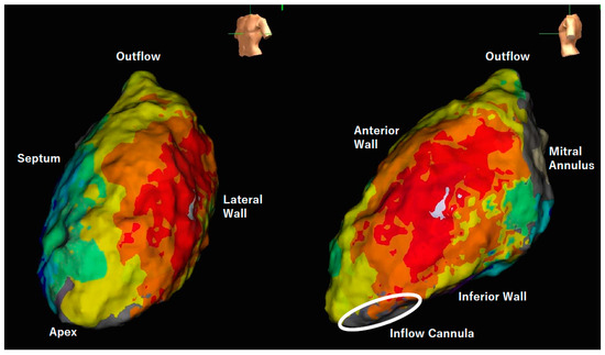 Activation map of ventricular tachycardia in a patient with HeartMate 3 support.