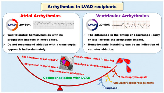 Tachyarrhythmias originating from both the atrium and the ventricle are frequently encountered in LVAD recipients. While robust hemodynamic support typically mitigates the prognostic impact of tachyarrhythmias, some cases still result in a decline in their quality of life or hemodynamic compromise, necessitating invasive catheter ablation. Due to the distinctive hemodynamics and patient vulnerability inherent in LVAD recipients, catheter ablation-related complications exhibit a wide spectrum of diversity, rendering them more susceptible to occurrence compared to patients without LVAD implantation. The population of LVAD-supported patients is expected to increase, serving as both a bridge to transplant therapy and a destination therapy. To address the intricate and refractory arrhythmia issues in LVAD patients, not only electrophysiologists but also circulatory support specialists and surgeons should collaborate with each other. There is also a pressing need for further accumulation of knowledge concerning the impacts of catheter ablation and the associated procedural complications (see Figure 5).