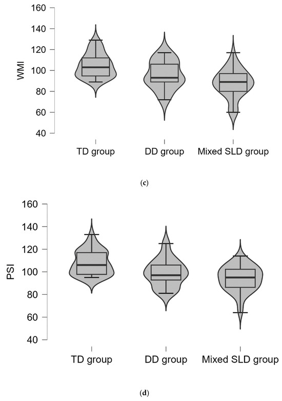 WAIS-IV mean index scores of the TD group (n = 38), DD group (n = 16), and Mixed-SLD group (n = 38). VCI = Verbal Comprehension Index; PRI = Perceptual Reasoning Index; WMI = Working Memory Index; PSI = Processing Speed Index. (a) shows the Verbal Comprehension Index (VCI); (b) shows Perceptual Reasoning Index (PRI); (c) shows Working Memory Index (WMI); (d) shows Processing Speed Index (PSI).