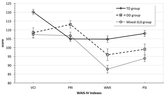 Our results indicated significantly lower performances on WAIS-IV VCI, WMI, and PSI in the Mixed-type SLD group, and on VCI and PSI in the DD group, compared to typical students. These results partially contrast with the previous study by Gontkovsky and Golden [52] that, when investigating the cognitive profile in adults with DD between 20 and 62 years of age, found in these individuals significantly lower scores only on the WAIS-IV WMI when compared to the scale’s normative sample. Thus, our findings suggest that different cognitive profiles may emerge in university students with different types of SLD and highlight the importance of studying the university students with SLD specifically.