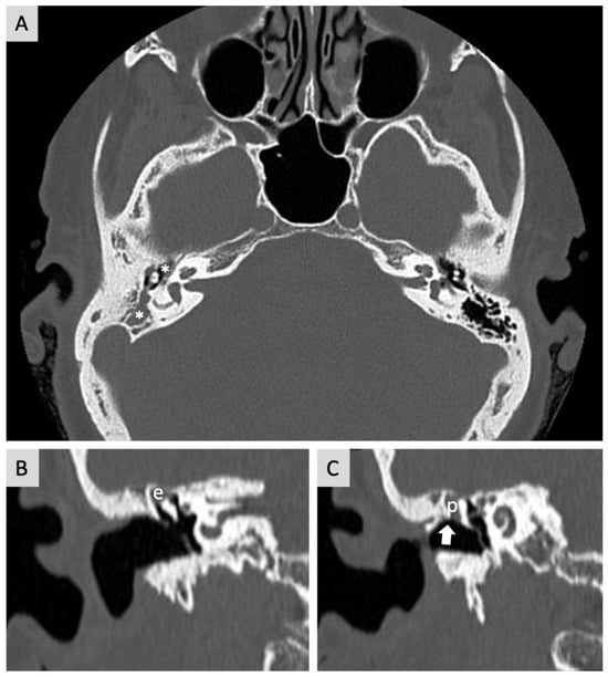 Head CT. (A) Axial—opacification of mastoid cells and middle ear on the right side (*). (B,C) Coronal—filling of the epitympanum (e) and Proussak space (p) with erosion of the spur of Chaussé (arrow) in the right ear.