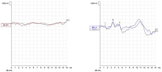 Auditory Brainstem Response (ABR) with click 90 dB stimuli showed no response—absence of waves—in the right ear (red) and normal responses—presence of waves I, III and V with normal latencies and interpeak intervals—in the left ear (blue).