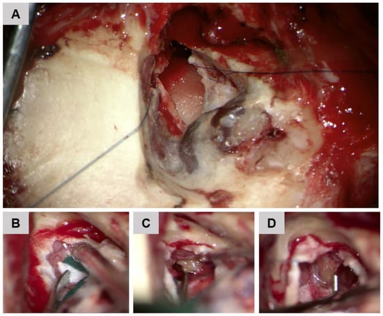 (A) Translabyrinthine access to the cerebello-pontine angle. (B) Opening of the internal auditory canal. (C,D) Resection of the vestibular schwannoma in the internal auditory canal.