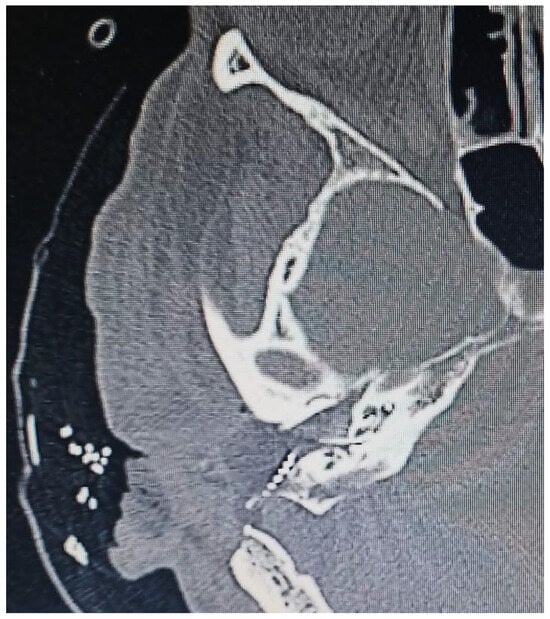 The patient underwent tympanomastoidectomy with the resection of the cholesteatoma (Figure 5) and subtotal petrosectomy with blind sac ear canal closure, followed by the translabyrinthine approach to treating the vestibular schwannoma (Figure 6). The preservation of the cochlea and auditory nerve allowed subsequent cochlear implantation in the right ear. Complete electrode insertion was performed via round window, with normal intraoperative impedances. Control Head CT on the first day after surgery showed no evidence of pneumocephalus or hemorrhaging and certified the correct electrode insertion (Figure 7).
