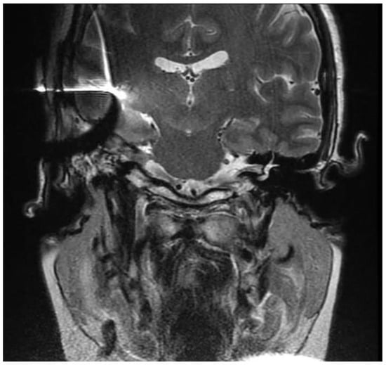 The follow-up otoscopy revealed blind sac ear canal with a wound in great condition. The patient is currently undergoing weekly aural rehabilitation therapy with a team specialized in cochlear implants. Despite magnetic artifacts due to the cochlear implant in the right ear, postoperative MRI (Figure 8) allowed the identification of heterogeneous material filling the surgical cavity, corresponding to the scarred area, and the T2-weighted scan revealed hyposignal in the right cochlear basal turn due to the cochlear implant electrode array. Periodic MRI scans will be performed to monitor possible neuroma recurrences.