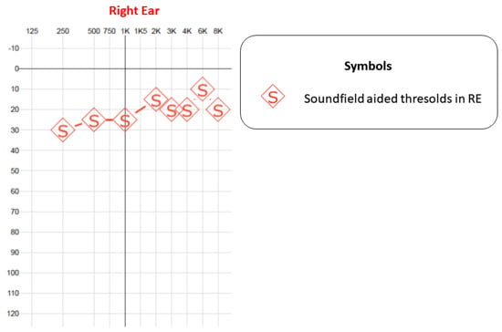Postoperative aided hearing thresholds with CI on the right ear. Measurement obtained in soundfield with contralateral masking. RE—right ear.