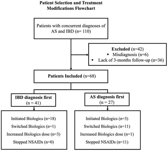 Of the 110 patients with documented co-diagnoses of AS and IBD in their clinical records, 42 were excluded from the study. Of these, 6 patients were inappropriately assumed in their medical record to have IBD or AS, while 36 did not have a minimum follow-up duration of 3 months with either a gastroenterologist or rheumatologist after their secondary diagnosis. The final study cohort included a total of 68 patients with a male predominance (40 patients, 59%), with a median age of 43 (IQR 31–55), and 78% (53 patients) had CD. Baseline characteristics and treatment modification at the time of the second diagnosis are reported in Table 1, Figure 1.