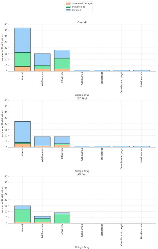 The majority of patients (58 patients, 85%) underwent treatment modification at the time of the second diagnosis. Out of the total cohort, biologic therapy was initiated in 28% of the patients (21 patients), immunomodulators in 9% (6 patients), and 5-ASA in 6% (4 patients). NSAIDS was stopped in 16.2% of the patients (11 patients). The current biologic regimen was augmented in 6% of the patients (4 patients) and the biologic regimen was switched in 17.6% (12 patients) (Table 1). Biologic therapy was swapped out-of-class in 9/12 patients (etanercept/secukinumab to anti-TNF) and was changed intraclass in 3/12 patients (anti-TNF agents). Biologic therapy was predominantly initiated in patients who received an initial diagnosis of IBD, compared to those with a primary diagnosis of AS (18/41 patients vs. 3/27 patients, p < 0.01). Specifically, the initiated agents were adalimumab (10/21 patients), infliximab (7/21 patients), golimumab (1/21 patients), etanercept (1/21 patients), certolizumab pegol (1/21 patients), and ustekinumab (1/21 patients). Conversely, switching to a new biologic agent and the discontinuation of NSAIDs were more commonly observed in patients initially diagnosed with AS compared to the IBD group (41% vs. 2%, p < 0.01, 41% vs. 0%, p < 0.01, respectively) (Table 2, Figure 2).