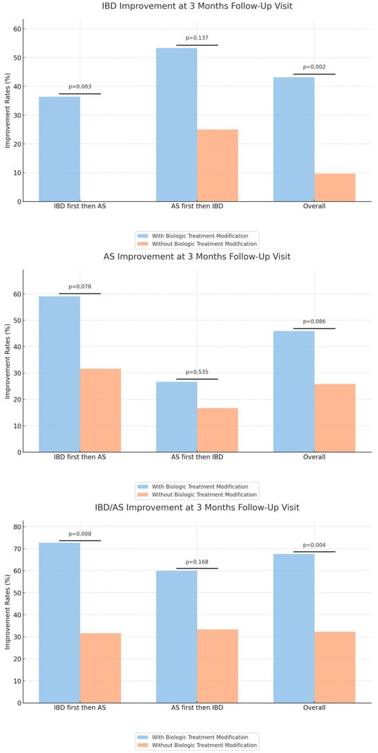 Interestingly, patients who underwent biologic modifications experienced significantly higher rates of clinical improvement in either IBD or AS at the 3-month follow-up compared to patients who did not (68% vs. 32%, p = 0.004). However, the improvement in IBD was more pronounced than in AS, with rates of 43% IBD improvement among patients with biologic modification compared to 10% among the other group (p = 0.002) (Table 4, Figure 3).