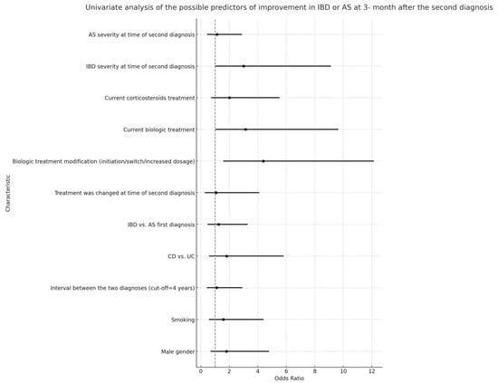 Multivariable logistic regression analyses indicated that the severity of IBD at the time of the secondary diagnosis was not correlated with a significant improvement in either IBD or AS at the 3-month follow-up (Figure 4 and Figure 5). However, a notable association was observed between a higher rate of improvement in AS/IBD and biologic treatment modifications made at the time of the second diagnosis (OR 3.69, CI 1.08–12.58, p = 0.037), as detailed in Table 5.