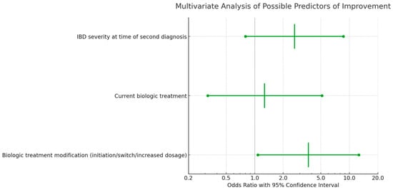 The significance of biologic therapy emerges from the univariate analysis where patients on a current biologic treatment demonstrated an odds ratio of 3.142 for improvement, which was statistically significant (p = 0.046). Interestingly, the severity of IBD at the time of the second diagnosis almost reached statistical significance (p = 0.053) in relation to improvement, which might suggest that the timing of the therapy modification in relation to disease severity is crucial.