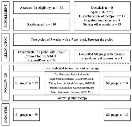 A total of 110 patients completed the study; 79 of them were assigned to the S1 group participating in rehabilitation with RAGT, including 62 men and 17 women, and 31 were assigned to the S0 group, including 27 men and 4 women. The disproportion in the number of control group patients was caused by patients resigning when they were not assigned to RAGD rehabilitation group (see Table 1). Also, the situation caused by the COVID-19 pandemic caused 11 patients in the S0 group to not complete the rehabilitation cycle.