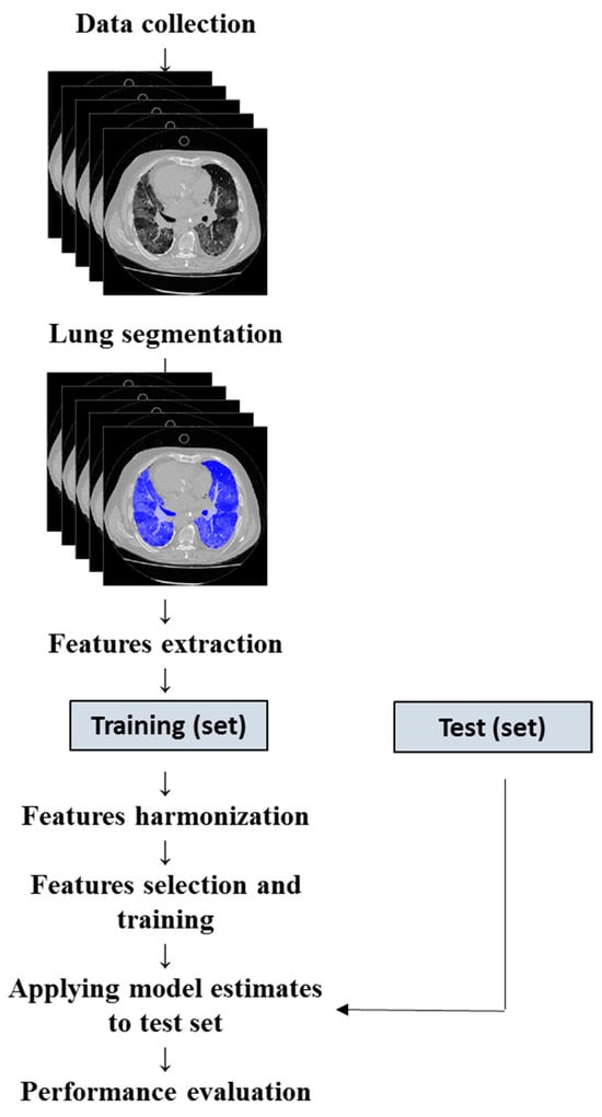 In compliance with the Imaging Biomarker Standardisation Initiative (IBSI) protocols (https://arxiv.org/abs/1612.07003 accessed on 24 July 2023), we applied intensity discretisation and spatial resampling before feature extraction. Images were discretised with a 64-bin width and resampled to 2 × 2 × 2 mm3 voxel size with B-spline interpolation. Before analysis, we applied the ComBat harmonisation method [28] to extracted features to remove batch effects from different scanners’ images, using the “neuroComBat 1.0.13” package in R. We applied ComBat harmonisation to the training dataset alone, and subsequently applied estimates obtained from training data harmonisation to the test set. Radiomic features were extracted in the open-source software package Pyradiomics (https://github.com/Radiomics/pyradiomics/releases, accessed on 9 October 2023 v3.1.0), and a total of 43 features were extracted from each CT lung image [22]. Among them were three first-order statistical features, nine Gray-level co-occurrence matrices (GLCM), thirteen Gray-level run-length matrices (GLRLM), thirteen Gray-level size-zone matrices, a Gray difference matrix (GLSZM), and five Gray difference matrix features (NGTDM).
