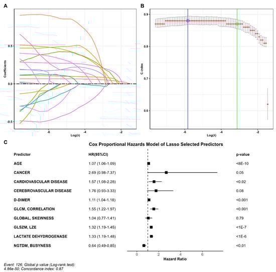 Ten out of fifty-seven variables with non-zero coefficients survived the LASSO regression and were thus included in the predictive model. The parameter producing a C-index within one standard error was 0.044, corresponding to a C-index of 0.87 (standard error = 0.014) (Figure 2A,B). Selected variables included age, D-dimer, LDH, three groups of comorbidities and four radiomic variables (Figure 2C).