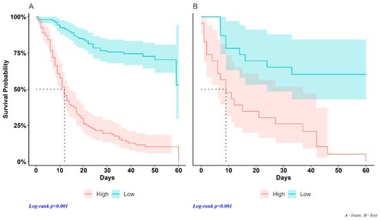 Survival curves. Training data set (A): the survival time of SARS-CoV-2 patients in the high-risk group differed significantly from that of the low-risk subjects, with a median of 12 days (95% CI; 10–14). The low-risk group did not achieve the 50% survival rate. Test dataset (B): the median survival duration of the high-risk group was 9 days (95% CI; 6–37) and low-risk patients did not reach the median survival of 50%.