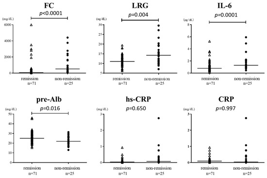 Comparison of each biomarker in patients in clinical remission and those not in remission. FC, fecal calprotectin; LRG, leucine-rich alpha-2 glycoprotein; IL-6, interleukin-6; pre-Alb, prealbumin; hs-CRP, high-sensitivity C-reactive protein.