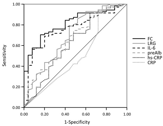 Only the AUCs for FC and IL-6 were significantly higher than the AUC for CRP. (AUC:0.81, 0.76 vs. 0.50; p = 0.001, 0.005) (Table 2). In contrast, LRG had moderate accuracy (AUC = 0.70), which was higher than the AUC of CRP but not significantly (p = 0.105). The AUCs for pre-Alb and hs-CRP were low and did not differ significantly from those for CRP (AUC:0.66, 0.63 vs. 0.50; p = 0.141, 0.333).