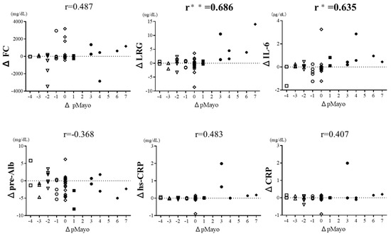 Correlation between pMayo change and change in each biomarker at two time points. When the correlation coefficient of ΔCRP was compared with those of the other biomarkers, those of ΔLRG and ΔIL-6 were significantly higher than that of ΔCRP: ** p < 0.01, * p < 0.05. FC, fecal calprotectin; LRG, leucine-rich alpha-2 glycoprotein; IL-6, interleukin-6; pre-Alb, prealbumin; hs-CRP, high-sensitivity C-reactive protein. The shape of the symbols in the graphs is represented by a different shape for each ΔpMayo value.