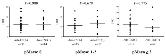 To examine whether LRG reactivity was blunted in patients with UC receiving anti-TNF antibody preparations, we compared LRG values between patients with and without anti-TNF antibody preparations; this comparison was only made between patients with the same clinical disease activity (pMayo: 0, 1–2, and ≥3). No association was observed between LRG and the administration of anti-TNF antibody preparations in any of the disease activity groups (Figure 4).