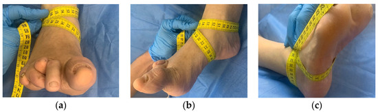 15] using a tape measure to measure inflammation at the talar and subtalar joint level, forming a figure resembling the shape of an “8” (