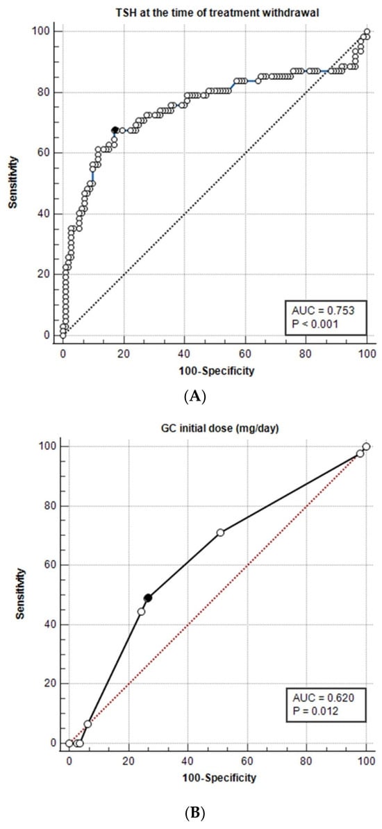 A step-wise logistic regression analysis was performed to evaluate the factors associated with the development of hypothyroidism. Demographical (age, gender, BMI), serological (ESR, CRP), hormonal (TSH, FT4, Tg, anti-TPO, anti-TG), before treatment initiation and at the time of therapy discontinuation. Additionally, treatment parameters (type of therapy, duration of therapy, initial dose, time to treat, and time to symptom relief) were also analyzed. After excluding non-significant variables, the model of TSH at the time of withdrawal, time to treatment, and duration of therapy was significant (Chi-square = 40.51, p < 0.001). The ROC curve was used to illustrate and evaluate the prognostic value of TSH levels at the time of therapy withdrawal on the development of hypothyroidism (Figure 1A). Results indicated that the cutoff value of TSH >4.12 μIU/mL (Youden’s index 0.508, 95% Confidence interval 0.368 to 0.629) showed an optimal sensitivity of 67.74% and a specificity of 83.04%.