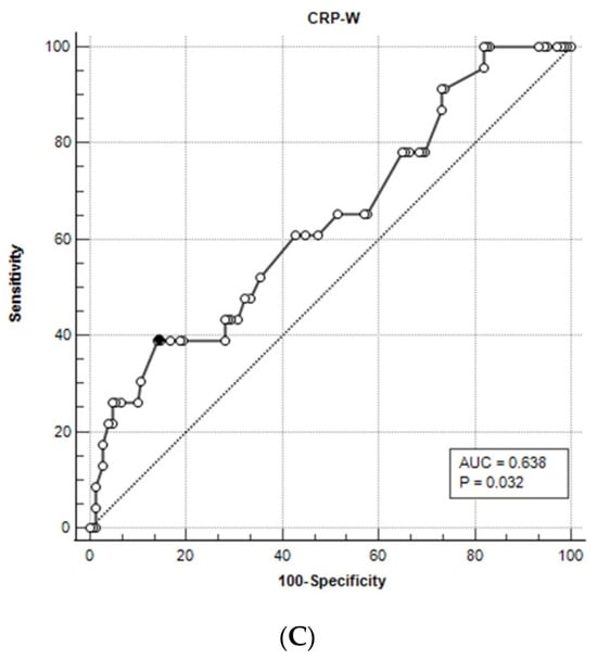A recurrence was observed in 28 patients (14.1%), and 26 of them were treated with cortisone preparations. A stepwise multiple regression analysis for the prediction of SAT recurrence was performed. The model included all serological indices (TSH, FT4, anti-tpo, anti-Tg, Tg, TKE, and CRP) before and after treatment withdrawal. Except for CRP levels at the time of treatment withdrawal (CRP-W, Coefficient: 0.095, Std. Error: 0.038, t: 2.511, p: 0.02), no other predictive factors were found in terms of SAT recurrence rate. Logistic regression analysis was performed to examine the influence of CRP-W on the prediction of SAT recurrence and showed a significant model (Chi-square = 6.699, p < 0.01). ROC analysis showed a significant positive coefficient of CRP-W, b = 0.263, p = 0.007, Odds Ratio 1.301, 95% CI 1.074–1.576. According to Youden’s index (0.2504), the best cutoff value for the CRP-W level was 2.6 mg/L, and the sensitivity and specificity were 39% and 86%, respectively. The optimal criterion was CRP-W >6 mg/L, with a sensitivity of 17.39% and a specificity of 97.32% (Figure 1C).