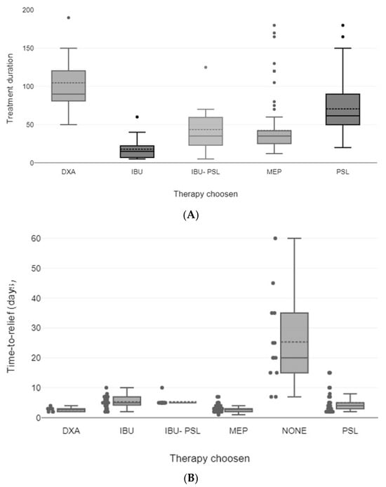 (A). Boxplot of the patient’s treatment duration. (B). Boxplot of the patient’s time-to-relief. Abbreviations: DXA, dexamethasone; IBU, ibuprofen; PSL, prednisolone; MEP, methylprednisolone; NONE, no therapy. The box indicates the range in which the middle 50% of all data are located. The solid line indicates the median, and the dashed line is the mean value. T-shaped whiskers indicate the last point, which is still 1.5 times the interquartile distance. All values above and below the whisker are outliers. Treatment duration and time to relief are expressed in days.