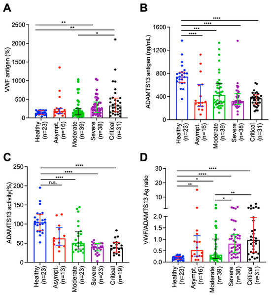 - Mancini, I.; Baronciani, L.; Artoni, A.; Colpani, P.; Biganzoli, M.; Cozzi, G.; Novembrino, C.; Boscolo Anzoletti, M.; De Zan, V.; Pagliari, M.T.; et al. The ADAMTS13-von Willebrand factor axis in COVID-19 patients. J. Thromb. Haemost. 2021, 19, 513–521. [Google Scholar] [CrossRef]