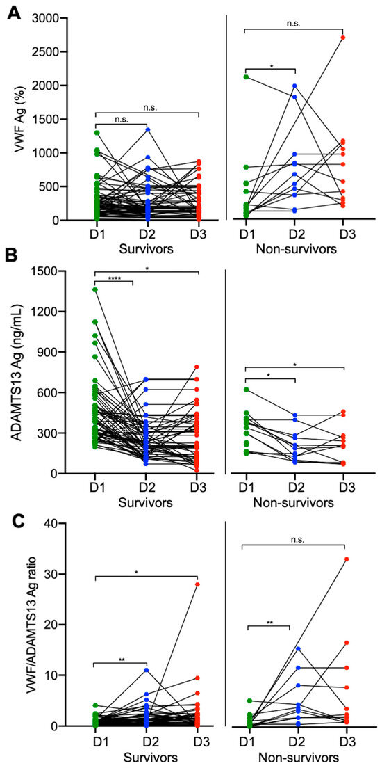 3.3. Dynamic Changes in Plasma VWF and ADAMTS13 in Patients with SARS-CoV-2 Infection